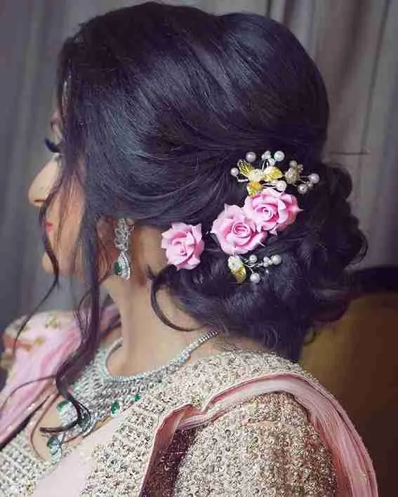 An open hairstyle with a partition at the side is another modern trendy hairstyle for saree. You can add more by making it slightly wavy, which keeps the simplicity at its peak. When you are going to attend a wedding or need to go to a normal get-together, it will enhance the entire elegance. It is the more preferred saree hairstyle for short hair, as it beautifies your face by adorning the overall appearance of your saree. To add extra, use trendy hairpins, and if you want, then apply maang tika that will highlight the parting.