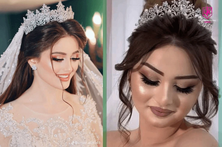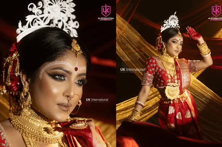 The Bengali bridal makeup look is the most perfect and iconic style in India. It is known for its grace, tradition and bold beauty. This makeup mainly focuses on bold winded eyeliner, deep red lip, and glowing base. This makeup look completes with the red banarasi saree and shakha-pola bangles with traditional white crown (mukut). Chandan designs on the bride’s forehead is one of the important singer for a bride which completes the bengali makeup look.