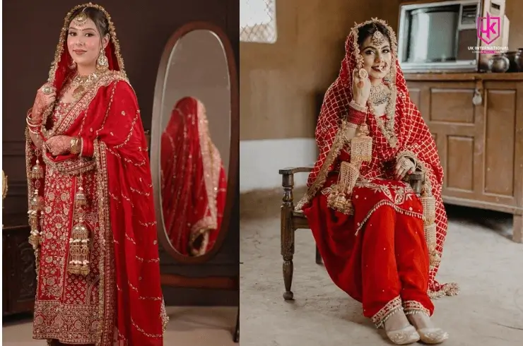 Muslim bridal makeup has a standout and elegant look. This makeup mostly focuses on bold base, heavy eye kajal makeup, well-defined bows and bold red lips. They complete their look via wearing traditional sharasas with heavy double dupatta. They usually wear heavy jewellery with matha paasha.